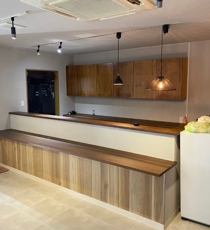 床張り、天井壁クロス、照明含む電気工事、カウンター等大工工事、各所塗装